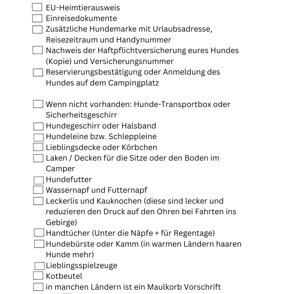 - Vorabklärung, ob Haustiere mitgenommen werden dürfen (Campingplatz, Fähre etc.)